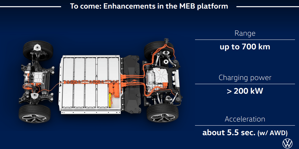 VW plant technische Verbesserungen für seine Elektroauto-Plattform MEB. Wie aus einer in dieser Woche veröffentlichten Präsentation von Silke Bagschik, Vertriebs- und Marketingleiterin für die ID-Reihe, beim UBS Paris Electric Car Day hervorgeht, strebt VW für den MEB künftig Ladeleistungen von über 200 kW und Reichweiten von bis zu 700 Kilometern an.