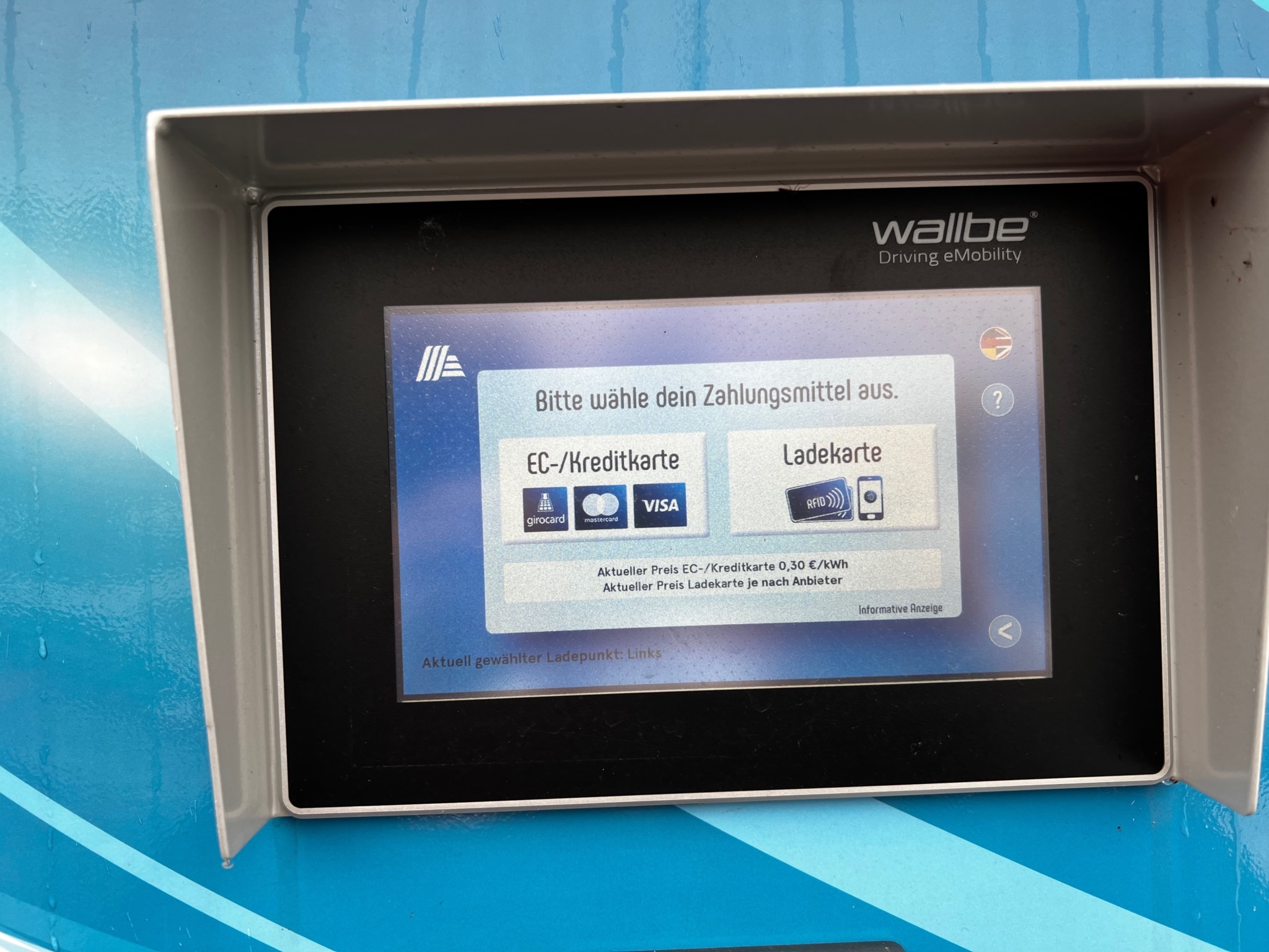 Ende Dezember plante Aldi offensichtlich noch mit 0,30 €/kWh. Diese Aufforderung am Bildschirm erhielt der Verfasser des nachstehenden Newsletters am 28. Dez. 2021an einer Aldi-Ladesäule.