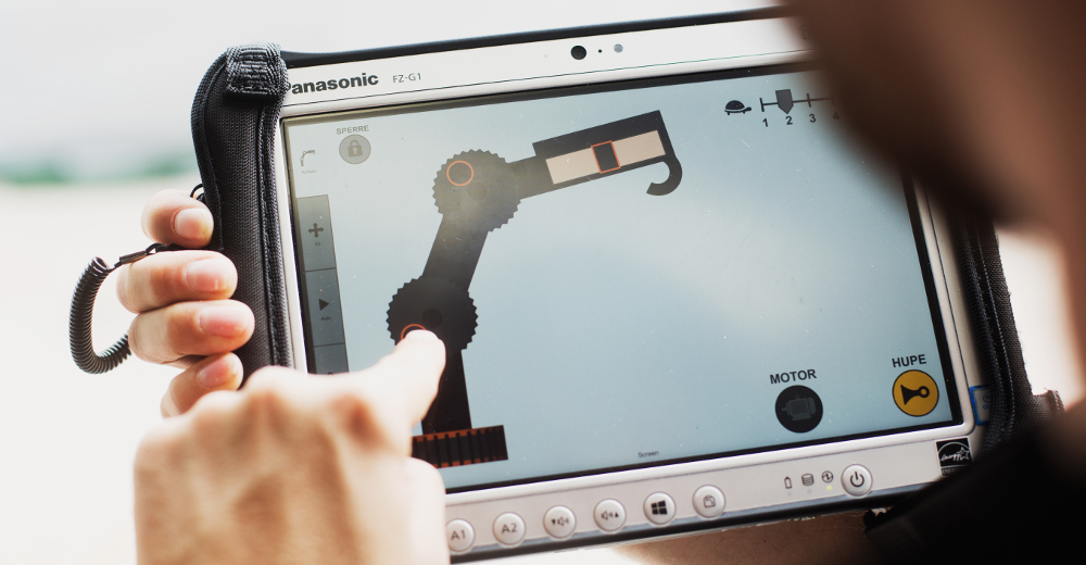 "Drückt er den Stick nach rechts vorne, fährt auch das Ende des Krans nach rechts vorne. "