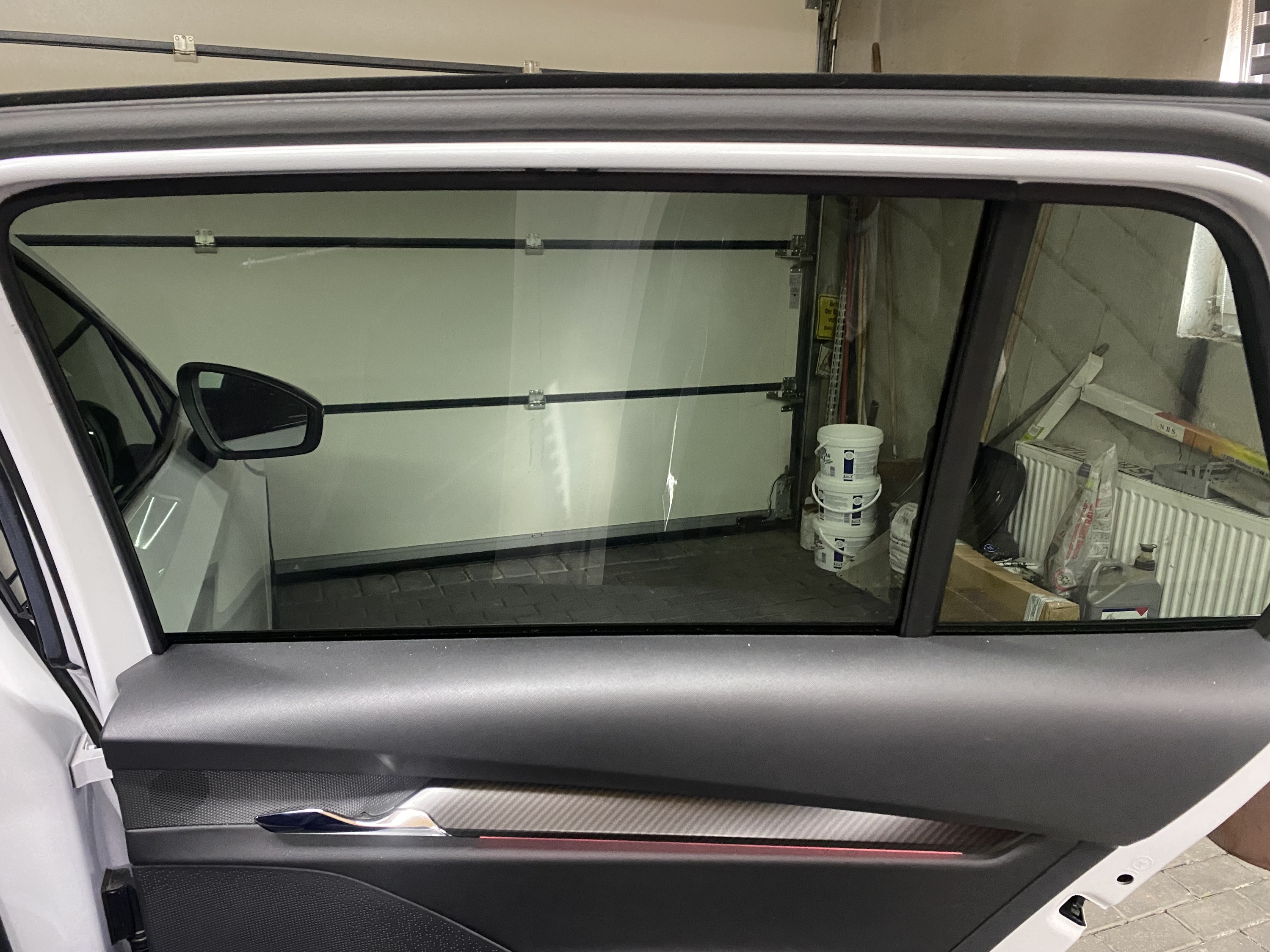 Leider hatte ich das Family Paket nicht bestellt. Aber da ich durch Zufall in der Bucht 2 Tür Verkleidungen mit Rollo für 160€ bekommen habe. Dachte ich mir ich rüste es nach. Aber leider war die leiste in schwarz Glanz und nicht in Carbon Optik. Deshalb musste ich das obere Teil mit dem Rollo austauschen.