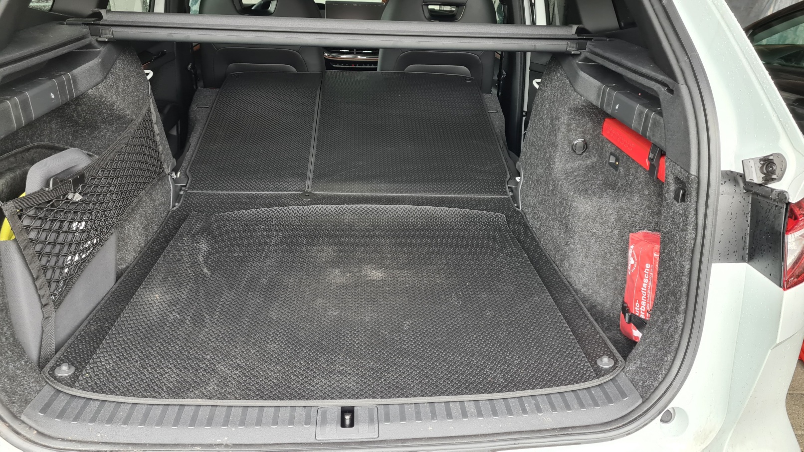 Wunderbare Kofferraumaufteilung, mit Netz, Kabeltasche und den Halterungen für das Warndreieck und den Verbandskasten.